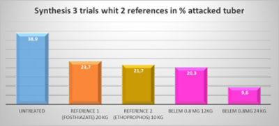 Onderstaande grafiek toont het gemiddelde resultaat van 3 proeven in Frankrijk en België na toepassing van zowel 12 kg/ha als 24 kg/ha. De toegelaten SHERPA 0.8 GR dosering in aardappels is 24 kg/ha om een voldoende lange bescherming te garanderen (dus ook voor de nieuwe knollen).